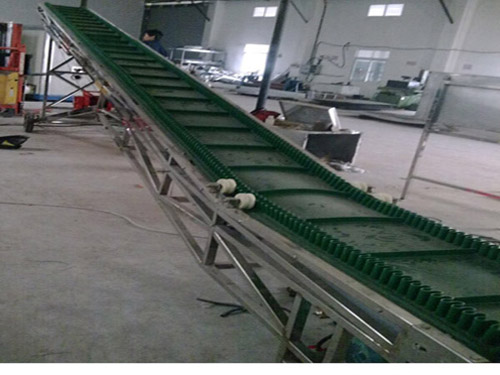 擋邊帶由基帶、擋邊和隔板組成,基帶外觀同曾通輸送帶,但橫向剛度更大:擋邊為波浪狀:陋板按其不 的斷面可分為T(mén)型、C型和TC型。T型適用于傾角β≤40°場(chǎng)合,C型適用于傾角β>40°且物料流動(dòng)性較好的場(chǎng)合,TC型適用于傾角β>40°,物料粘性較大,粘度較大的場(chǎng)合。